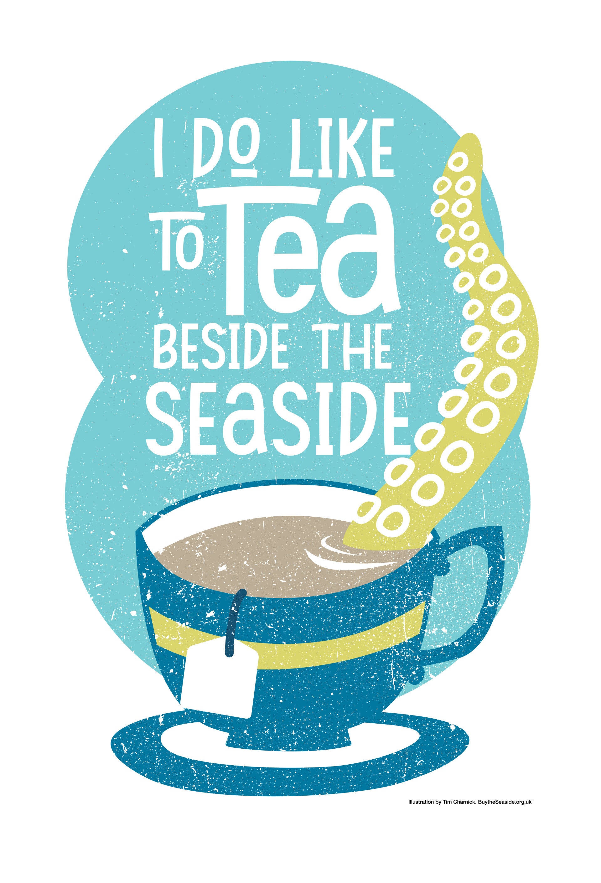 A lovely, bright and colourful 100% cotton Tea Towel with the words 'I do like to tea beside the seaside'